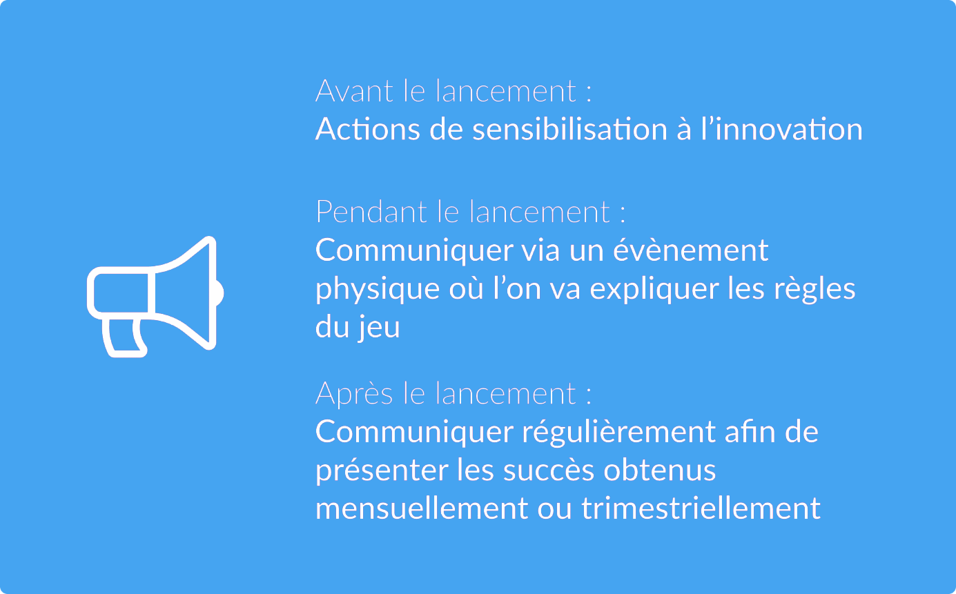 Vous pouvez proposer des formations à l’innovation participative, créer toute une communication visuelle à diffuser en interne sur support physique ou sur les écrans disponibles, écrire des posts sur les réseau sociaux ou l’intranet de l’entreprise.