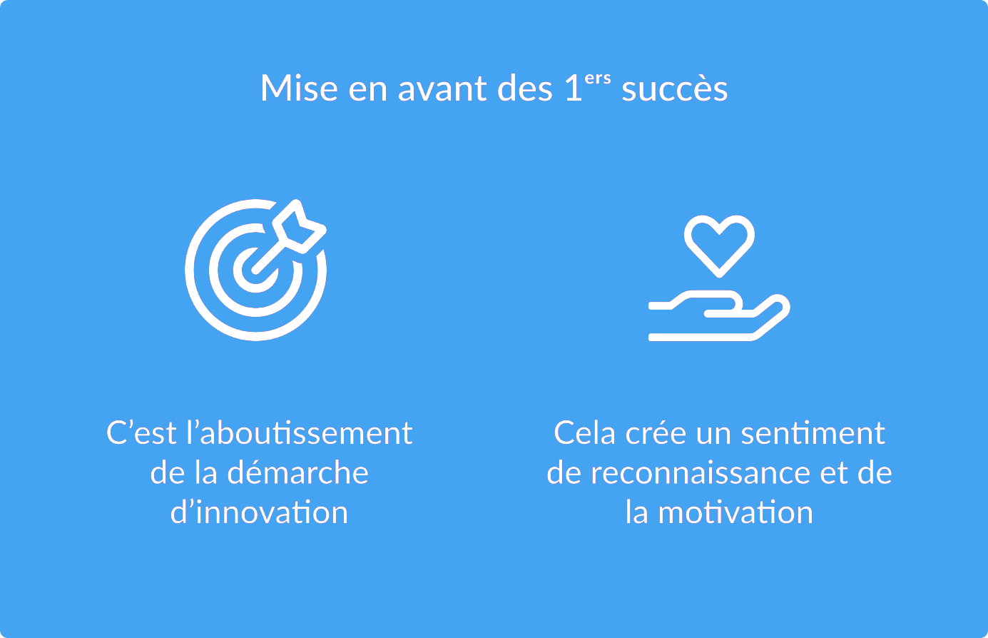 D’autre part, mettre en avant les premiers succès c’est créer un sentiment de reconnaissance de la part de l’entreprise et de la direction pour avoir contribué au développement d’un projet. Féliciter les collaborateurs aux yeux de tous permet d’assimiler une personne à son idée innovante, ce qui augmente son sentiment d’appartenance à l’entreprise. A long terme, l’engagement des collaborateurs s’en trouve augmenté.